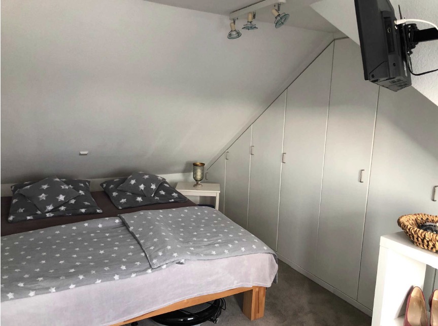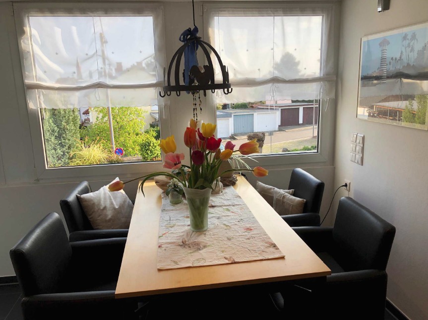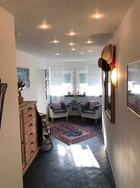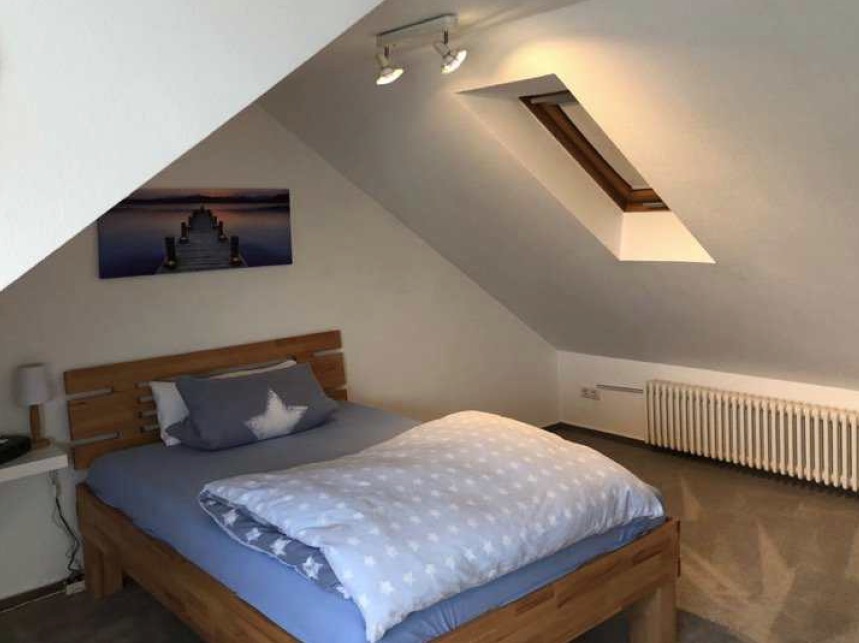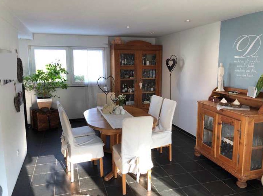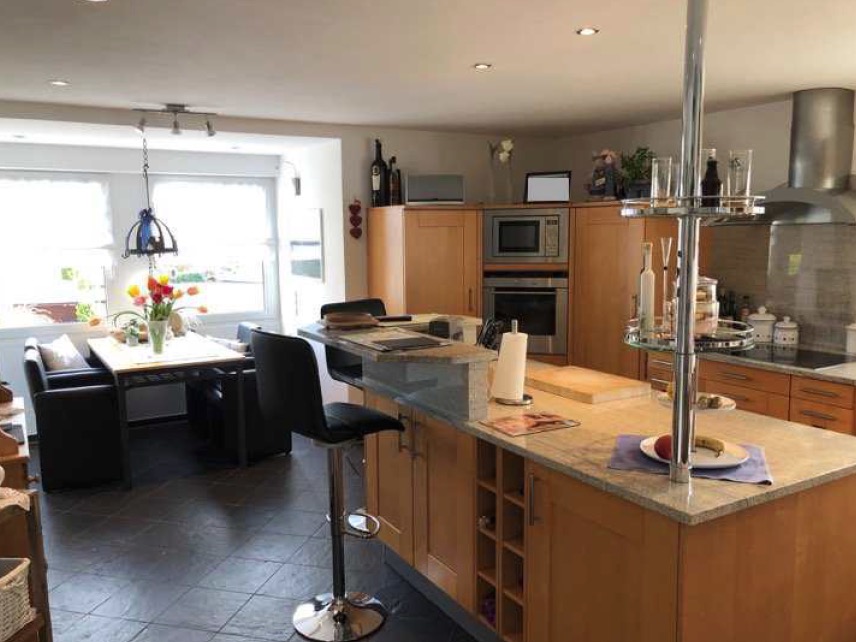 Im Winter sorgt der Specksteinofen im Wohnbereich für eine mollige Wärme. Eine großzügige Treppe führt ins Dachgeschoss. Dort befinden sich zwei Schlafzimmer mit Einbauschränken. Die gesamte Wohnung ist mit hochwertigen Bruchschiefer Fliesen ausgestattet und auch die großen Fenster sorgen für viel Helligkeit in den einzelnen Räumen. Ein Stellplatz, ein großer Keller und der gemeinsame Hauswirtschaftsraum runden dieses außergewöhnliche Angebot ab.