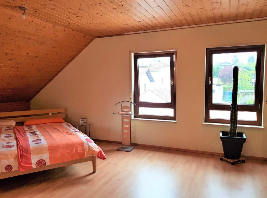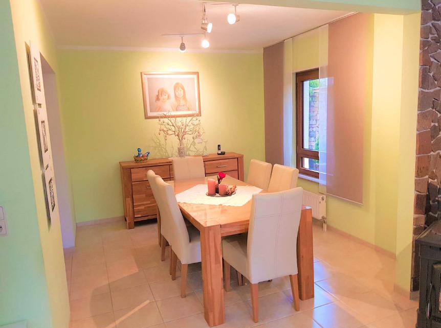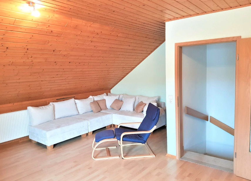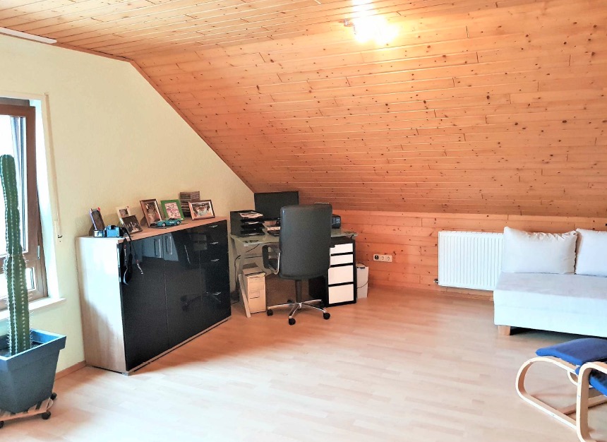 in das Gäste WC und linker Hand in die geschlossene Einbauküche mit Essplatz. Die Wand zum Wohn-Essbereich lässt sich bei Bedarf, ohne großen Aufwand öffnen. Eine Tür weiter gelangt man direkt in den hellen Wohn- Essbereich, welcher die Anschlussmöglichkeit für einen gemütlichen Ofen bietet. An den Wohnbereich schließt die große Terrasse, an welche zu gemütlichen Stunden im Garten einlädt. Im OG befinden sich die beiden Kinder- und ein Elternzimmer. Ergänzt wird diese Etage durch ein helles Bad mit Dusche und Badewanne. Über den großzügigen Treppenaufgang gelangt man in das ausgebaute Dachgeschoss. Hier wurde ein schönes Dachstudio eingerichtet, welches ca. 38 m² umfasst. Es bietet die Möglichkeit ein Elternbad einzubauen, da die Anschlüsse hierfür bereits bestehen. Zusammenfassend bietet dieses Haus sehr viel Platz und Freiraum für eigene
