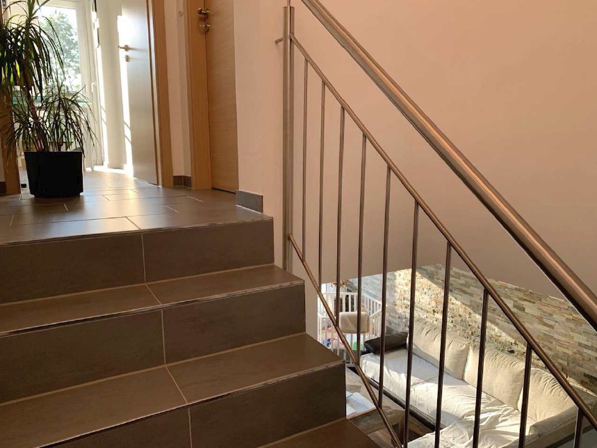– Boden EG und Treppenhaus mit Feinsteinfliesen ausgelegt