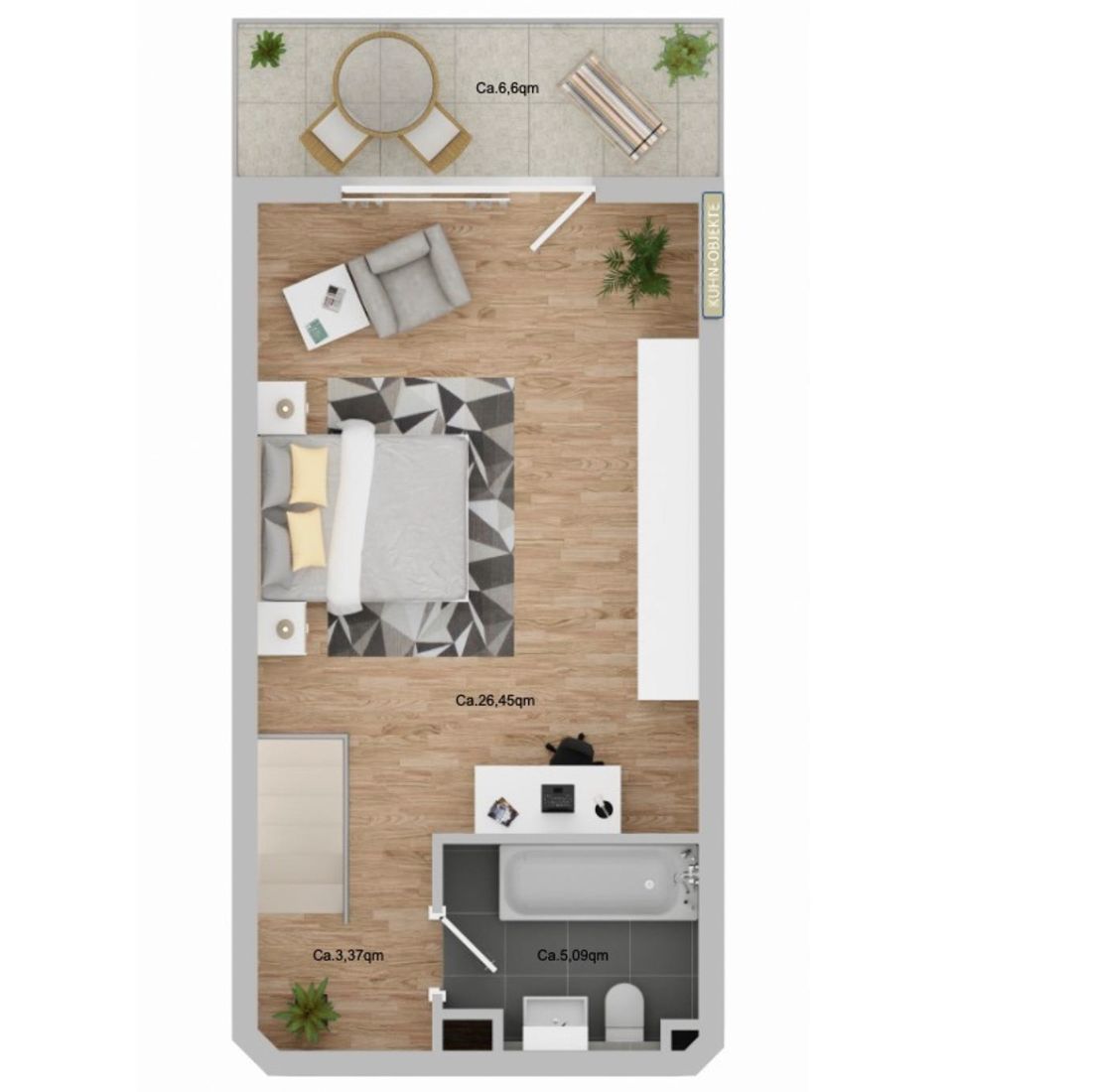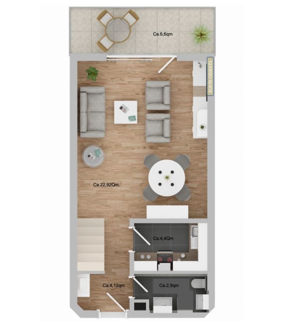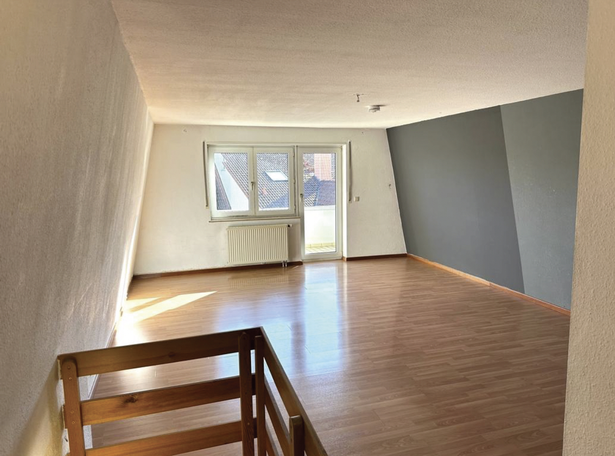 Diese attraktive zweigeschossige Wohnung besticht durch ihre durchdachte Raumaufteilung und ein modernes Wohnkonzept. Im ersten Obergeschoss befindet sich der einladende Wohnbereich, der durch seine Helligkeit und Großzügigkeit überzeugt. Eine abgeschlossene Küche bietet ideale Bedingungen zum Kochen. Ergänzt wird diese Ebene durch ein Gästebad, einen kleinen Flur sowie einen großzügigen Balkon welcher zu entspannten Stunden im Freien einlädt. Über eine kleine Treppe gelangt man in das obere Geschoss, dass mit einem großzügigen Schlafbereich aufwartet, in welchem sich auch problemlos ein Arbeitsbereich einrichten lässt. Das Badezimmer mit Badewanne sorgt für zusätzlichen Komfort, während ein zweiter Balkon für ein angenehmes Wohngefühl sorgt und den Blick ins Freie ermöglicht. Die gelungene Kombination aus Funktionalität und Komfort macht diese Wohnung zu einem idealen Zuhause für Singles oder Paare, welche Wert auf eine besondere Wohnatmosphäre legen