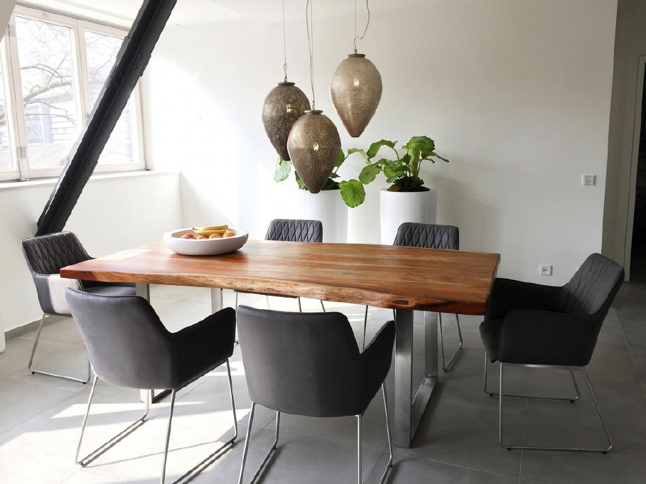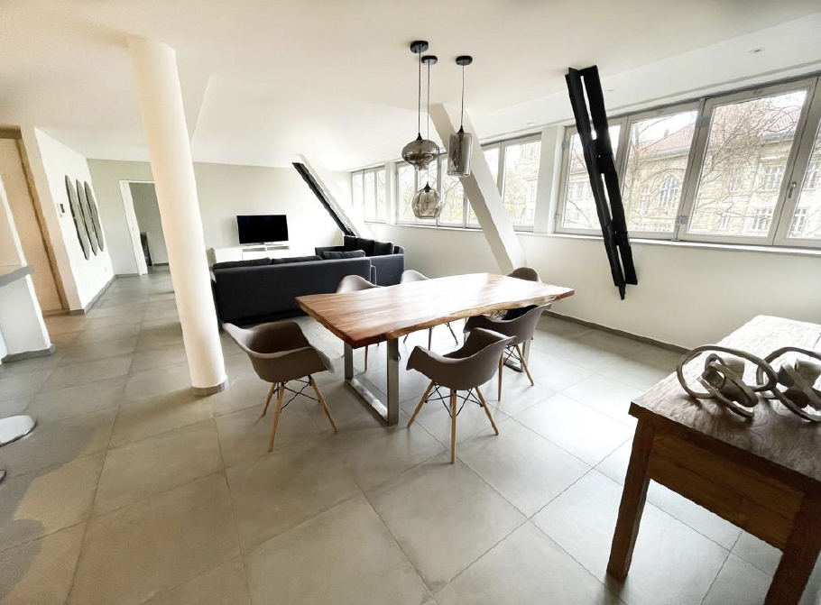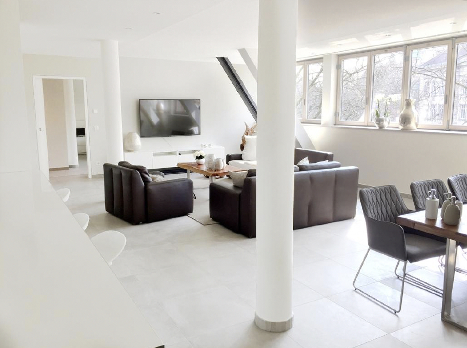 Ein Direktlift führt komfortabel und barrierefrei in die Wohnung. Bereits beim Eintreten eröffnet sich eine großzügige, repräsentative Wohnlandschaft mit loftartigem Charakter. Sichtbare Stahlträger setzen markante Akzente und unterstreichen die architektonische Klarheit des offenen Raumkonzepts.