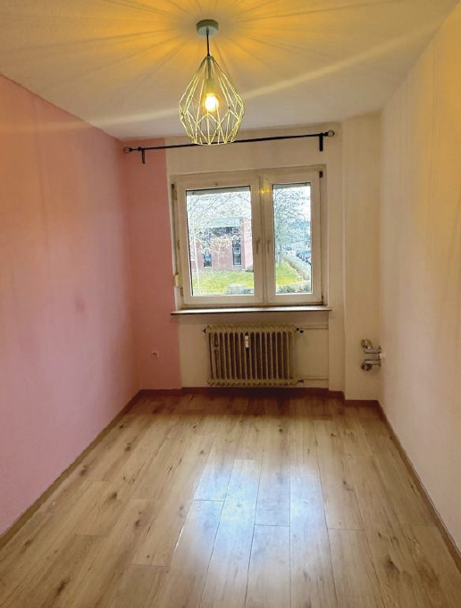 Von hier aus besteht Zugang zu einem der beiden Balkone, der eine gemütliche Atmosphäre schafft und zum Verweilen einlädt. Folgt man dem Flur weiter, befindet sich auf der linken Seite das Gäste-WC sowie das angrenzende Hauptbadezimmer mit Duschwanne. Beide Sanitärräume weisen Renovierungsbedarf auf und bieten somit die Möglichkeit, sie nach eigenen Vorstellungen modern zu gestalten. Gegenüber liegt ein weiterer Raum, der ursprünglich als Küche geplant war – diese Option kann weiterhin realisiert werden und eröffnet zusätzliche Gestaltungsfreiheit. Angrenzend befindet sich das Kinderzimmer. Am Ende des Flurs liegt das Elternschlafzimmer, das über einen direkten Zugang zum zweiten Balkon verfügt und somit einen privaten Rückzugsort mit Außenbezug bietet.
