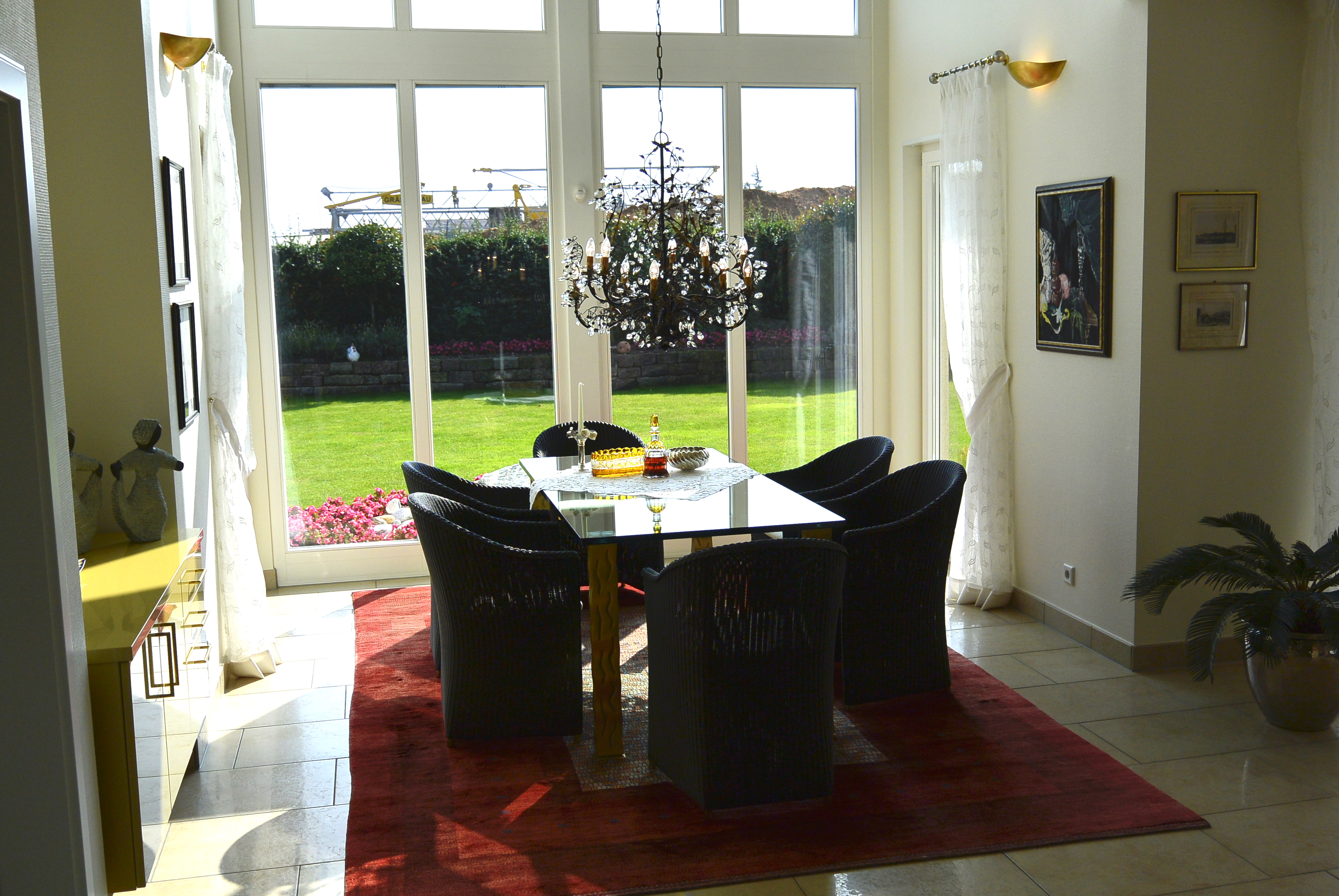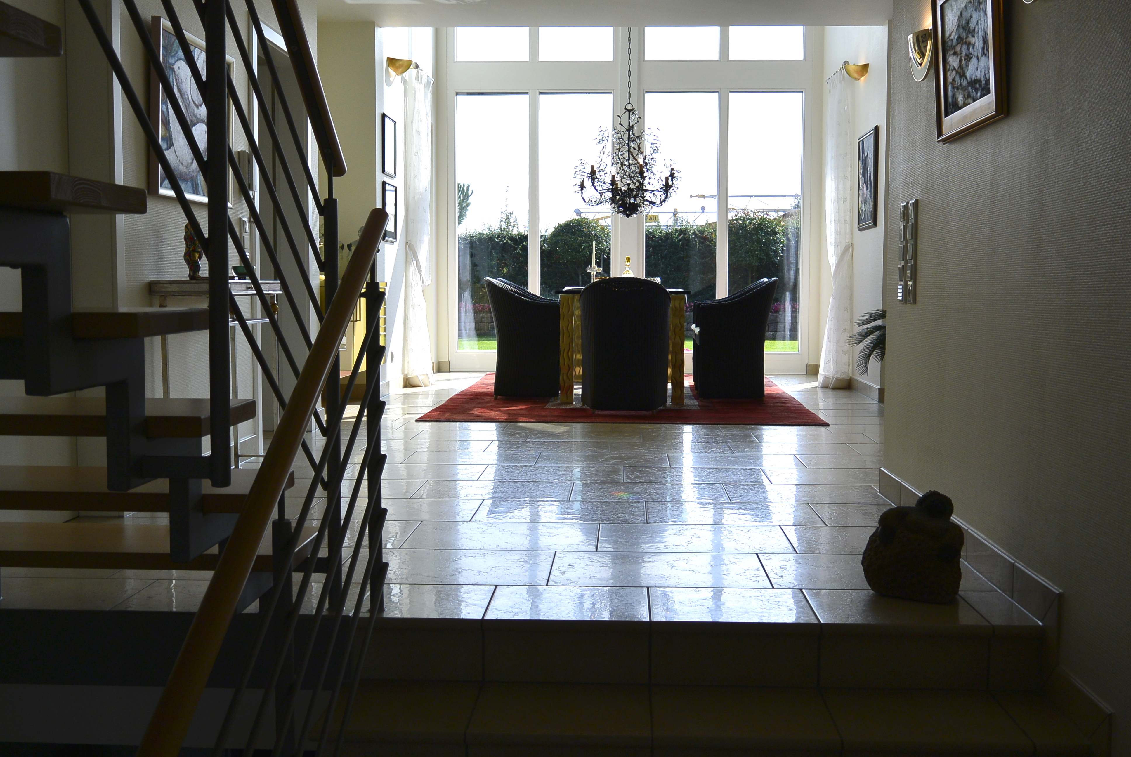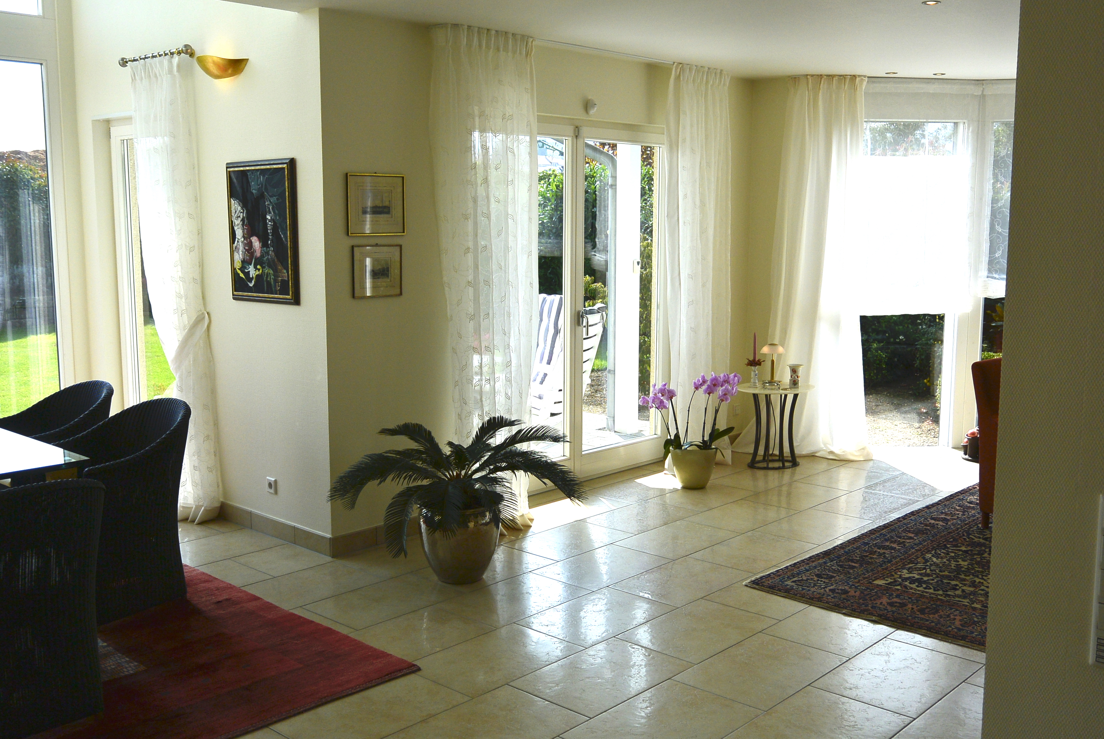 Über die einladende Diele mit eingebautem Garderobenschrank gelangen Sie in den Wohn- und Essbereich. Die modernen Panoramafenster geben einen freien Blick auf die gemütliche Sonnenterrasse. Der traumhafte Garten verfügt u.a. über einen sehr gepflegten Rasen und wird durch eine grüne Hecke vor unerwünschten Blicken geschützt.