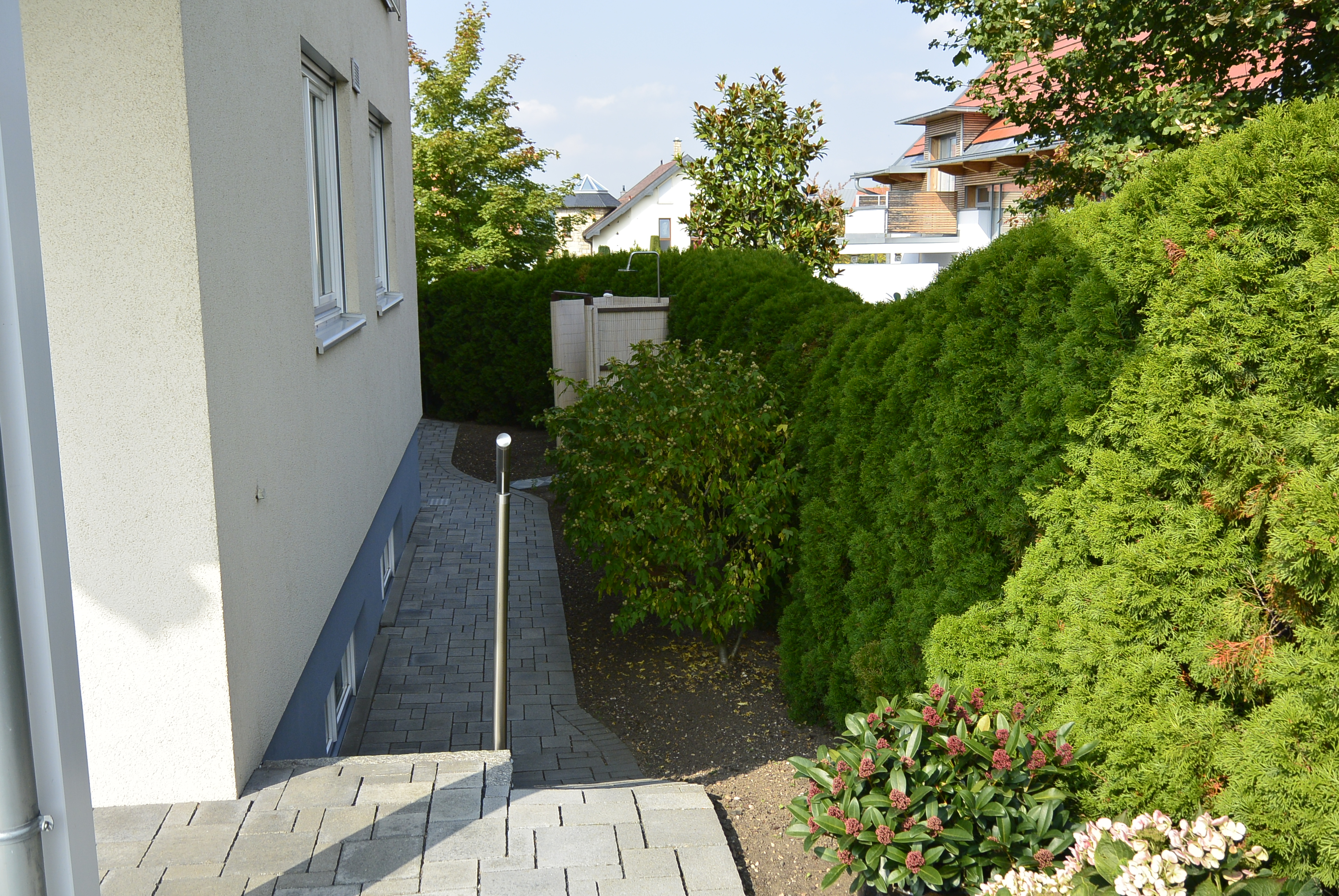 Sie betreten das sorgfältig gepflegte Grundstück auf einem gepflasterten Weg, der zum Eingangsbereich führt.