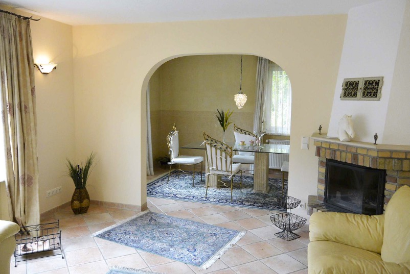 Esszimmer mit direktem Zugang (Rundbogen) vom Wohnzimmer und direktem Zugang zur Küche Wohnzimmer mit offenem, französischen Kamin – Übergang zu Esszimmer