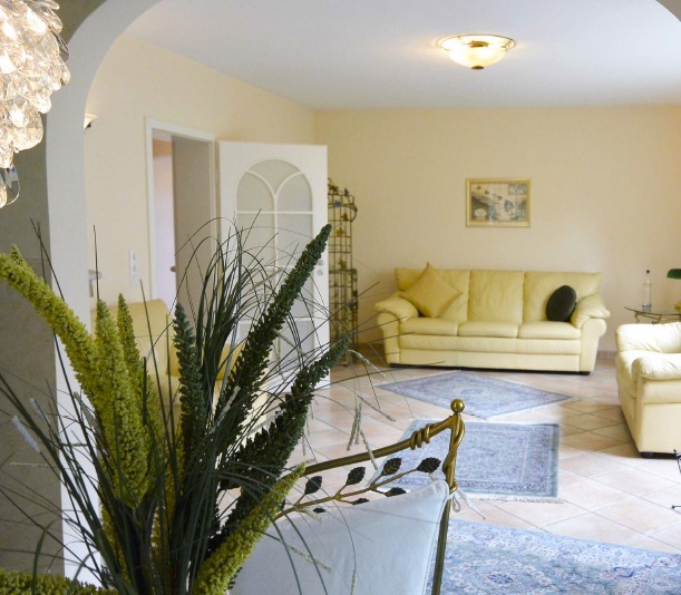 Der helle, lichtdurchflutete und großzügige Wohnbereich mit üppigen Fensterflächen verfügt über einen offenen, französischen Kamin mit Handschmiedearbeiten und ist optisch durch einen aparten Rundbogen vom Essbereich – über welchen Sie zur Küche gelangen – getrennt.