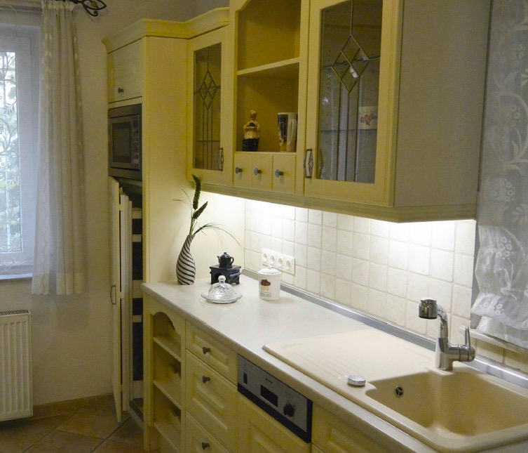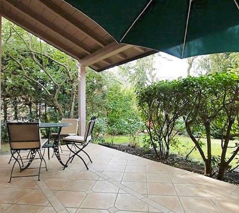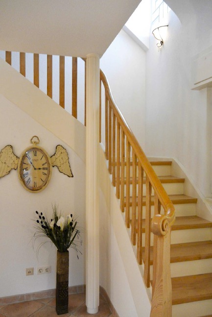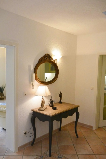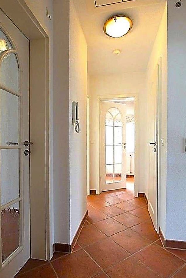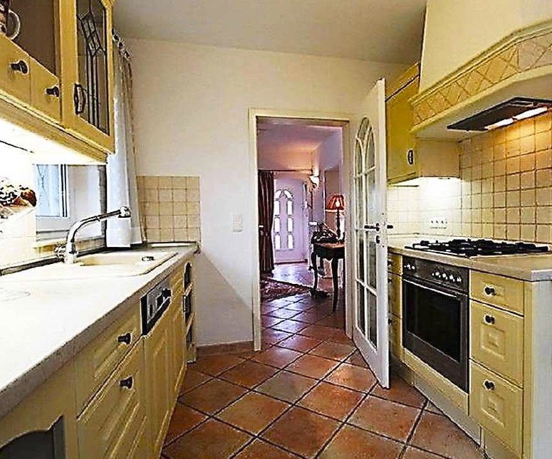 Die geräumige Landhausküche mutet durch den hochwertigen Bodenbelag aus italienischem Feinsteinzeug sehr mediterran an und passt stilistisch hervorragend zu den italienischen Terrakottaböden im gesamten EG, sowie dem ebenfalls mediterranen Terrassenbelag im idyllisch begrünten, uneinsehbaren Garten.