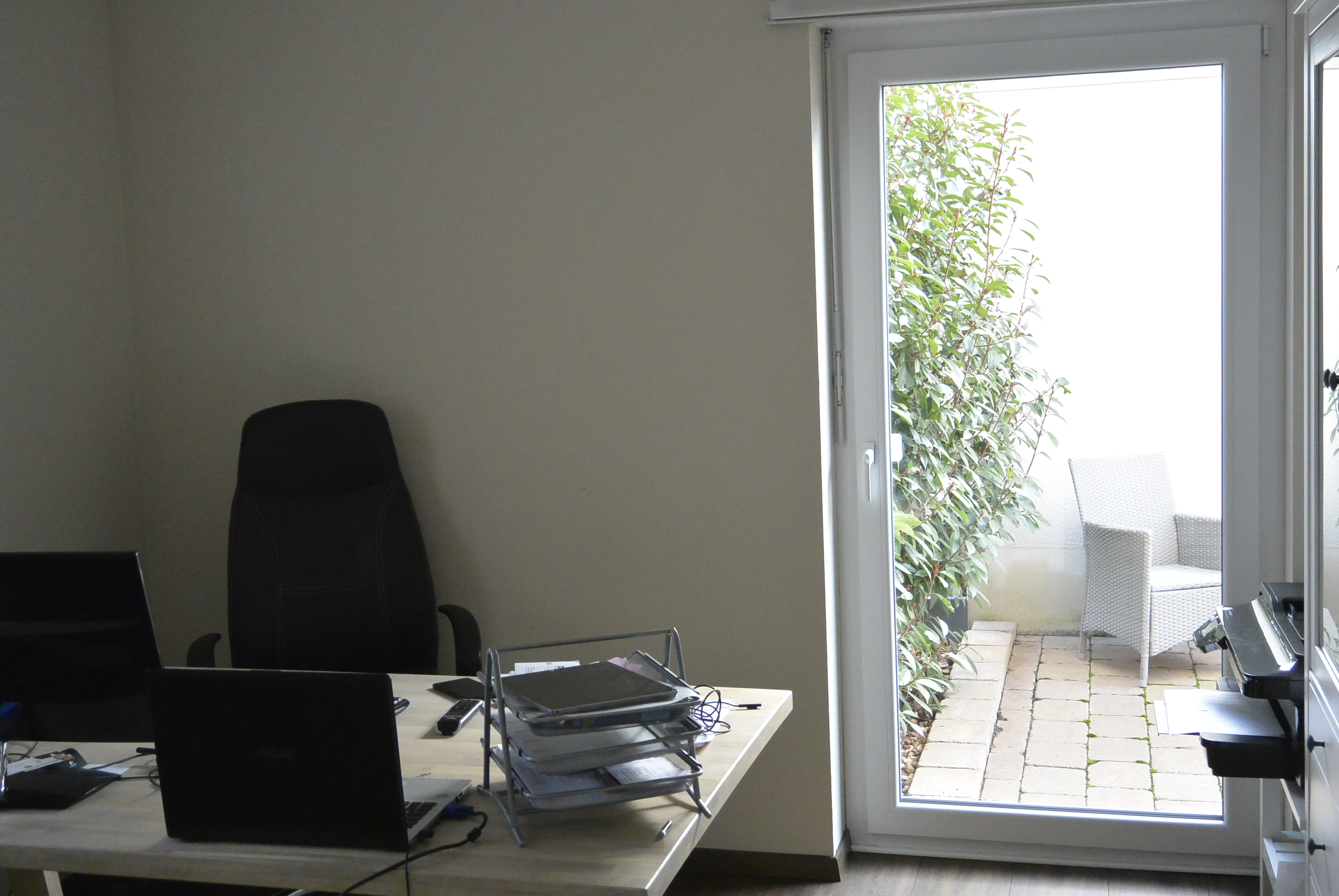 Das Erdgeschoss bietet neben dem Wohnzimmer, ein Gästebad mit Dusche sowie ein Arbeitszimmer mit eigener Terrasse.