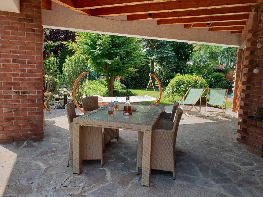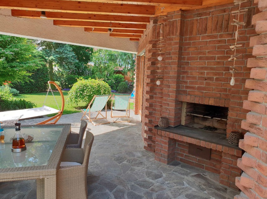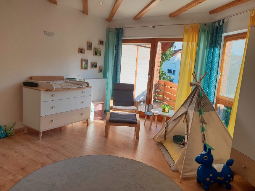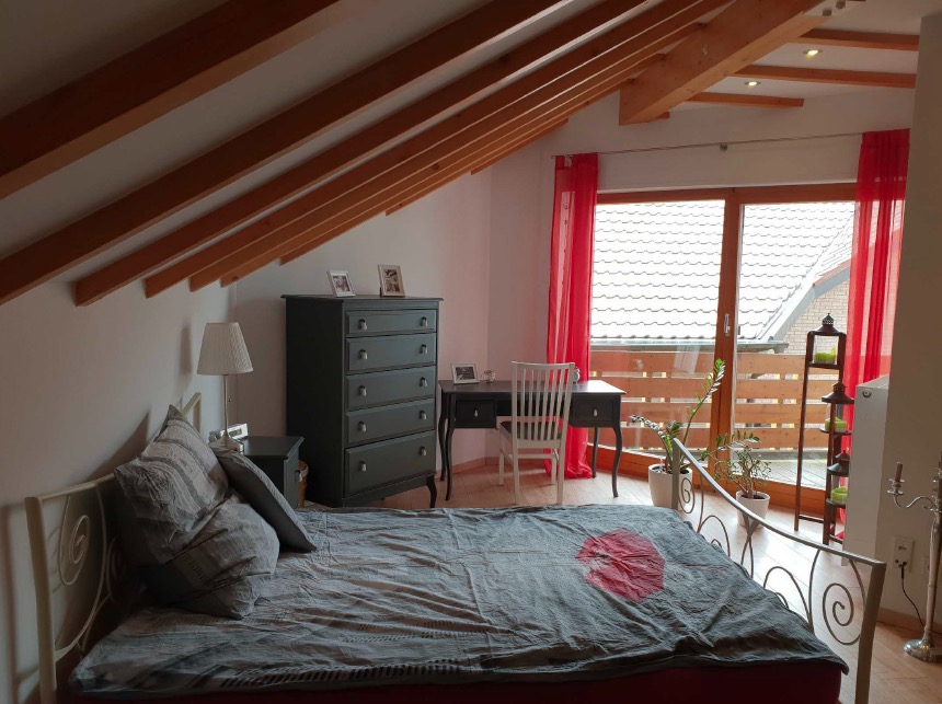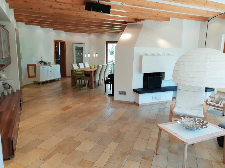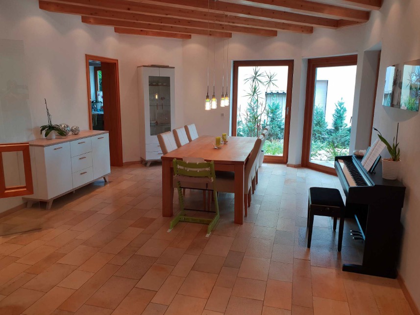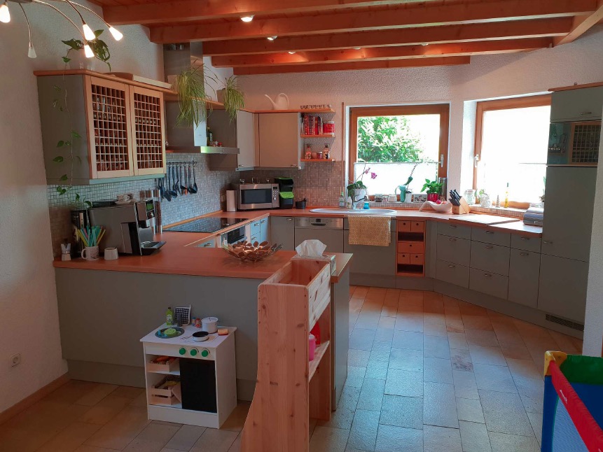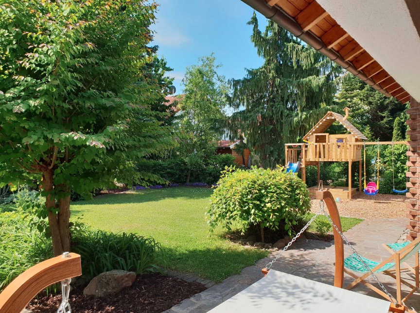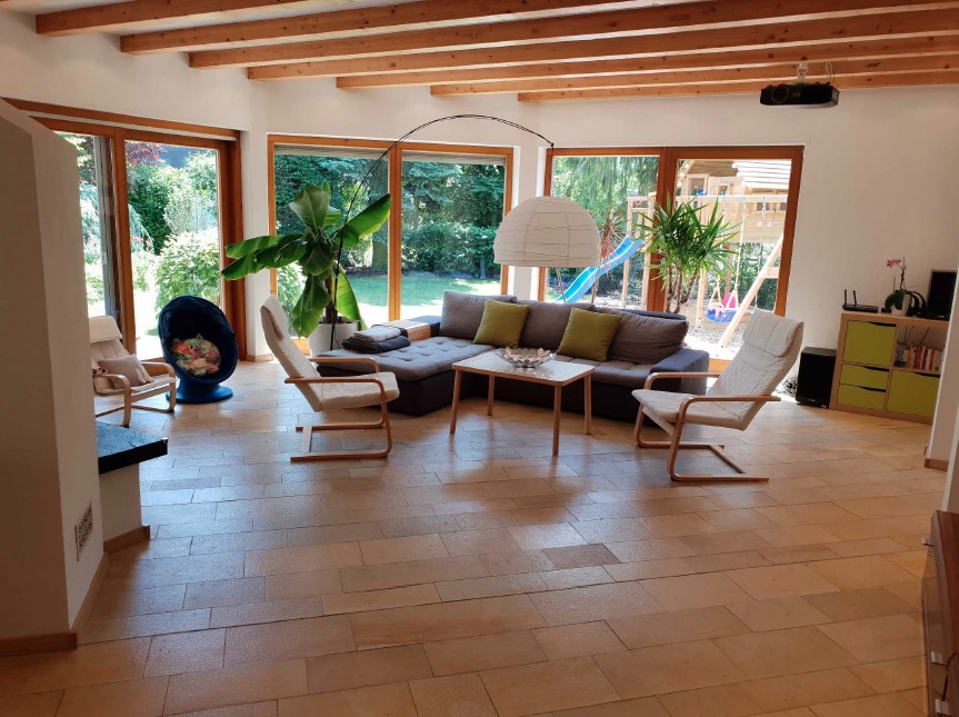 den man so nur selten findet. Die Außenfassade ist komplett verklinkert, was dem Haus einen besonderen Charme verleiht und obendrein sehr pflegeleicht ist. Garten und Wohnbereich sind komplett nach Süden ausgerichtet, sodass immer optimale Lichtverhältnisse herrschen. Im Inneren entsteht durch die Kombination von offenen Holzbalkendecken und großen Fensterflächen ein gemütliches Zuhause. Man betritt das Haus durch einen großen Eingangsbereich mit angrenzender Gästetoilette und direktem Zugang zur Küche mit gut erhaltener Bulthaup-Einbauküche. Die Elektrogeräte wurden alle in den letzten Jahren ausgetauscht. Es besteht die Möglichkeit die Einbauküche inklusive Geräte zu übernehmen. Der Eingangsbereich öffnet sich zum ca. 70m2 großen Ess- und Wohnbereich, wo der offene Kamin zusätzliche Wohnlichkeit und Wärme bietet. Die Böden im Erdgeschoss sind vollständig mit hochwertigem Natursteinboden (Solnhofener Platten) gefliest. Vom Wohnbereich gelangt man auf die überdachte Terrasse mit Außenkamin, die den Blick auf einen Bachlauf und die Rasenfläche freigibt. Der Garten bietet außerdem zahlreiche Pflanzflächen, ein Holzlager und einen Spielturm mit Rutsche, Sandkasten und zwei Schaukeln, der auch die kleinsten Bewohner begeistert. Vom Wohnzimmer aus gelangt man über eine uneinsehbare Treppe mit hohem Luftraum ins modernisierte Obergeschoss. Vom Flur erreicht man zuerst die zwei Kinderzimmer, die beide mit je über 20m2 sehr großzügig geschnitten sind. Beide Zimmer verfügen über zusätzlichen Stauraum hinter dem Kniestock und einen Zugang zu dem gemeinsamen Balkon. Eines der Zimmer verfügt außerdem über einen kleinen begehbaren Kleiderschrank. Darauf folgt ein Kinderbad mit Dusche.
