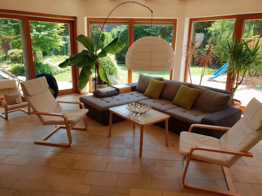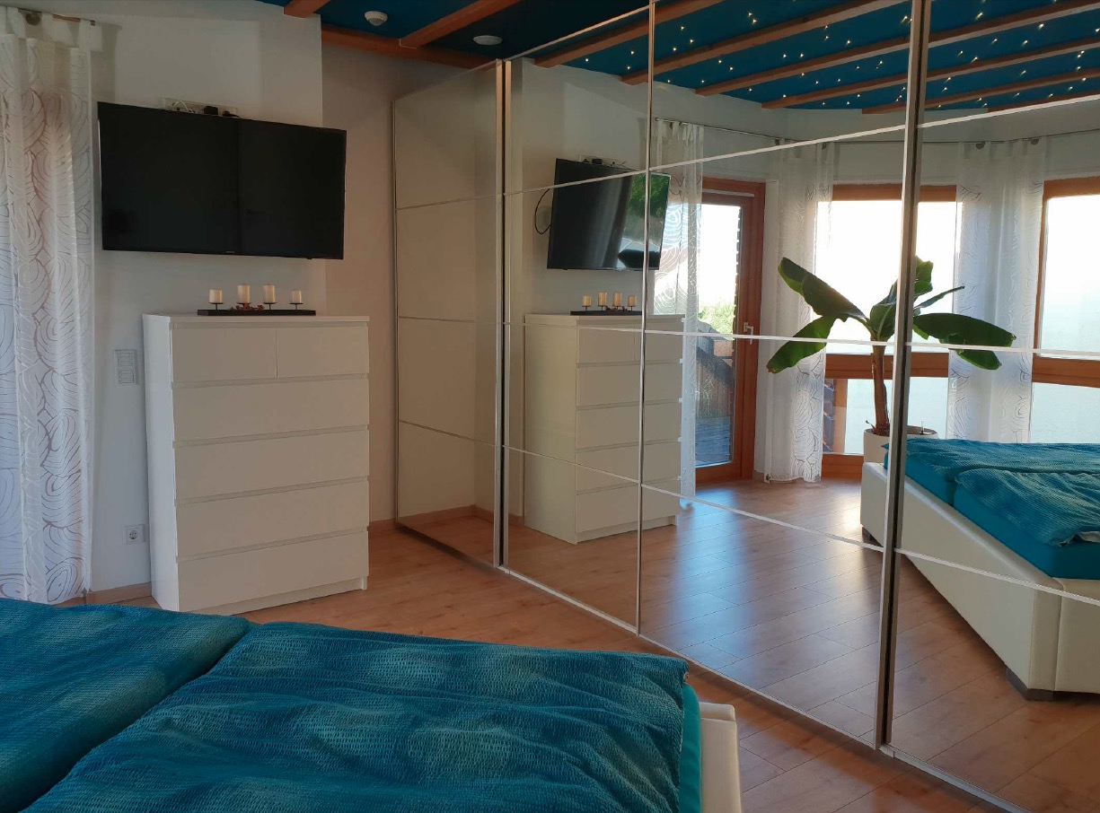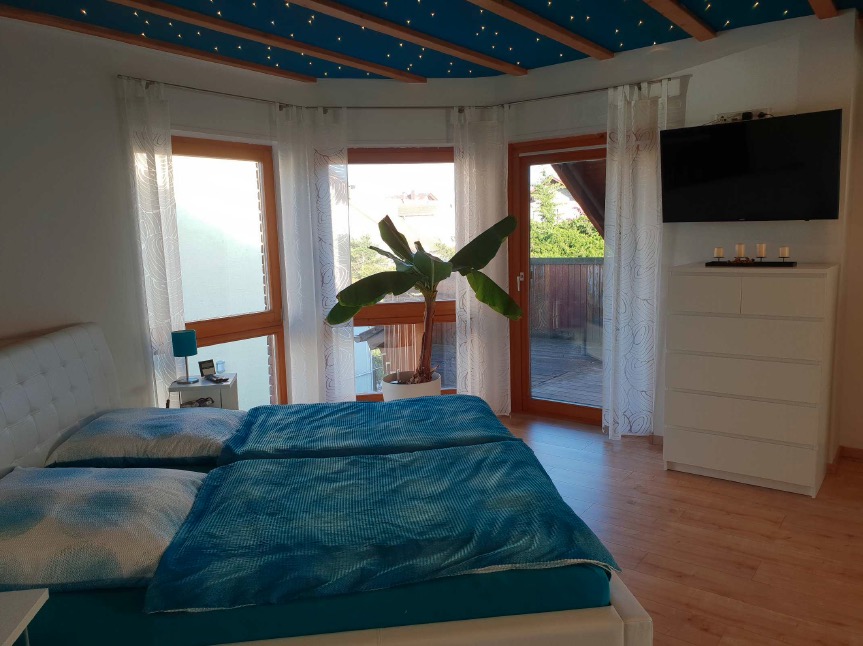 Das Schlafzimmer mit aufwändigem LED Sternenhimmel und eigenem Balkon lädt zum Träumen ein. Die neue Klimaanlage sorgt hier, wie auch in einem der Kinderzimmer, im Sommer für angenehme Kühle und im Winter bei Bedarf für schnelle Wärme. Im Flur befindet sich ein großer Einbauschrank und ein Frisiertisch. Von dort erreicht man das luxuriöse Hauptbadezimmer mit Jacuzzi, Dusche, Toilette und Bidet. Die indirekte LED-Beleuchtung und die Natursteinwand erzeugen eine erholsame Atmosphäre. Die in das Haus integrierte Garage mit angrenzendem Abstellraum bietet neben Platz für ein Auto auch ausreichend Fläche für Zweiräder und Gartengeräte. Vor der Garage befinden sich zwei weitere Stellplätze. Das Haus ist inklusive Garage voll unterkellert. Der Keller öffnet sich in einen fast 40m2 großen, renovierten Wohnraum, der aktuell als Büro genutzt wird. Von hier sind die weiteren Kellerräume (Vorratsraum, Waschküche/Heizraum, zwei Kellerräume und zwei Abstellkammern) erreichbar. Die Technik des Hauses wurde in den letzten Jahren aufwändig erneuert. So wurde die Elektrik auf ein KNX-Bus-System umgestellt und die meisten Räume mit Netzwerkanschlüssen (CAT7) ausgestattet. Alle Rollläden (außer in der Küche) sind elektrisch und über das Bus-System und über App steuerbar, ebenso wie das Licht und die Temperatur. Im Wohnbereich gibt es ein eingebautes Heimkino-System mit 2,5m Leinwand, Soundsystem und 3D-fähigem Beamer, das auf Wunsch übernommen werden kann.