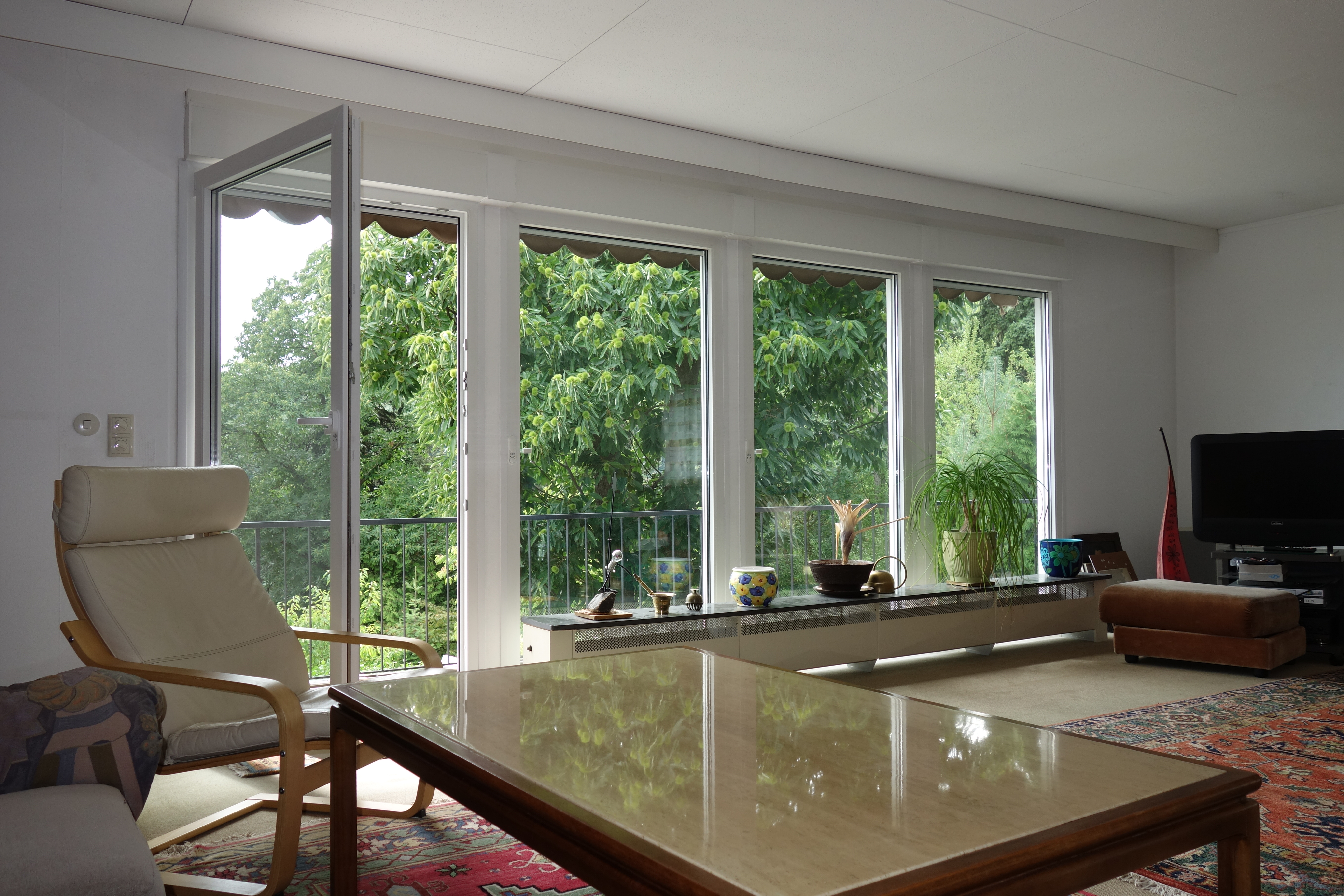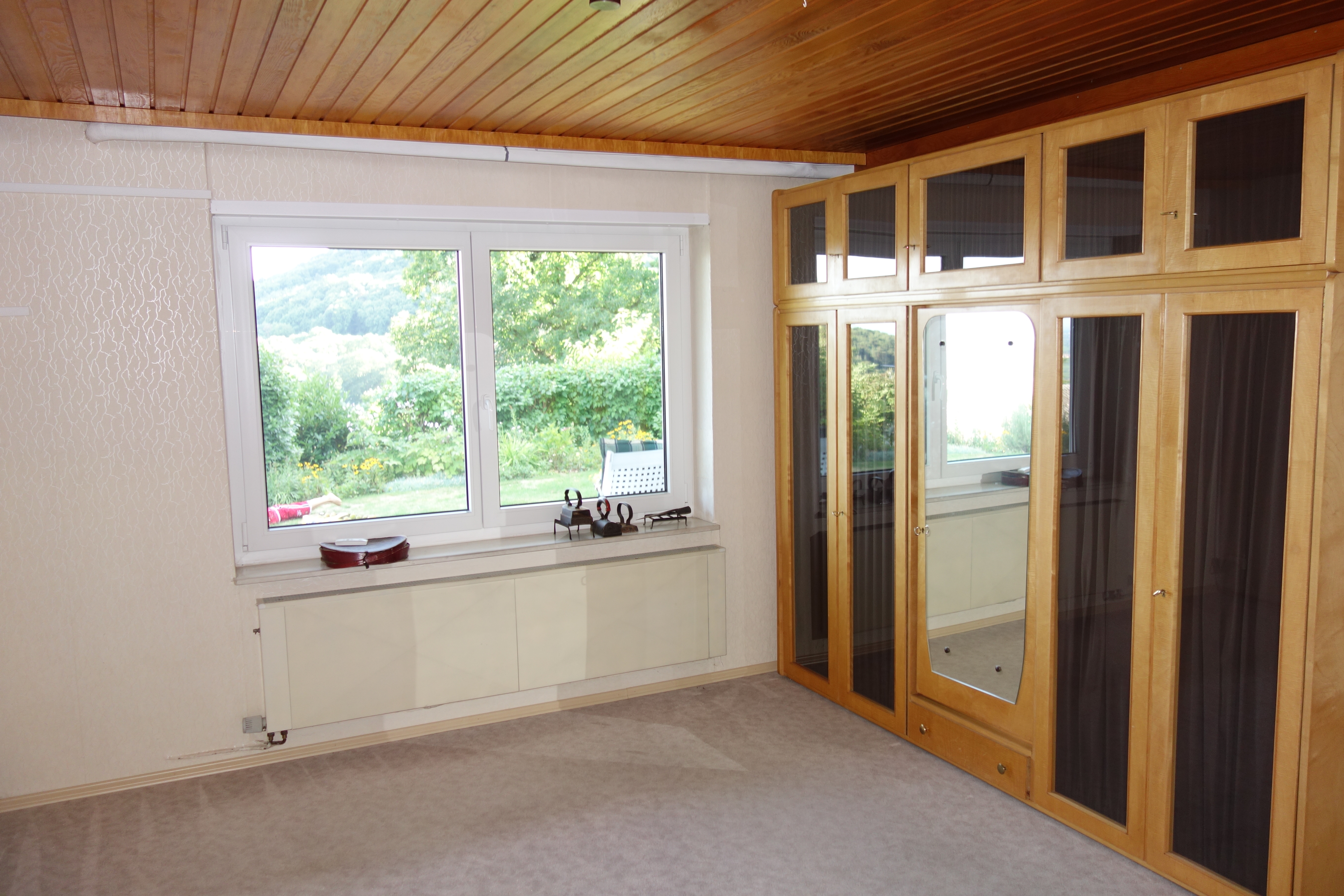 Das Erdgeschoss bietet, neben dem großzügigen Wohnzimmer mit Panoramafenster und Balkon, ein Tageslichtbad sowie 2 Schlafzimmer.