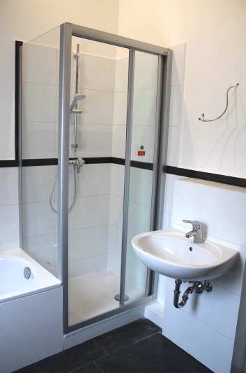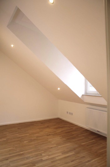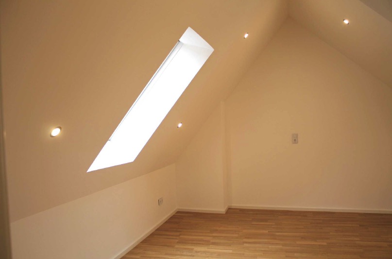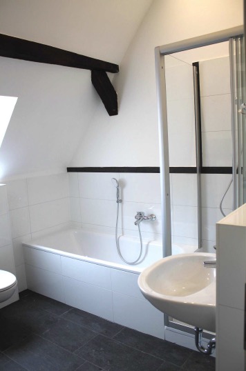 Dachflächenfenster. Gegenüber des Badezimmers mit Tageslicht, Wanne, Dusche, Waschbecken, WC und Handtuchheizkörper befindet sich ein kleiner Abstellraum.