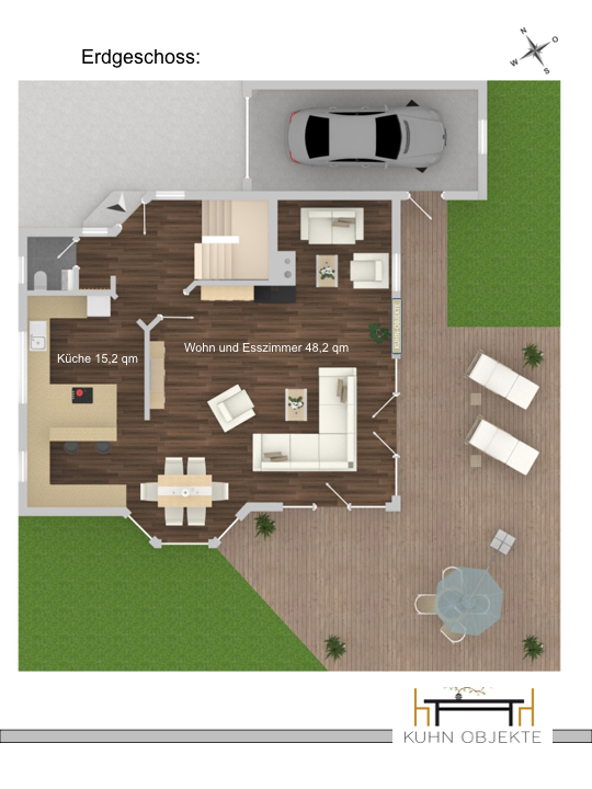 Sie haben von Ihrer Küche direkten Zugang zum großzügigen, ca.48,2qm großen Wohnraum. Die besondere Wirkung erhält dieser wunderschöne Wohnraum durch die zum Garten hin zu öffnenden bodentiefen Fenster.