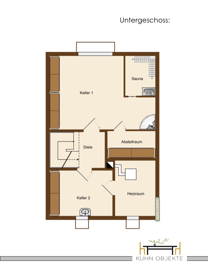 Dort befinden sich auch der Hauswirtschaftsraum, ein Abstellraum, der Heizraum sowie ein weiterer Kellerraum.